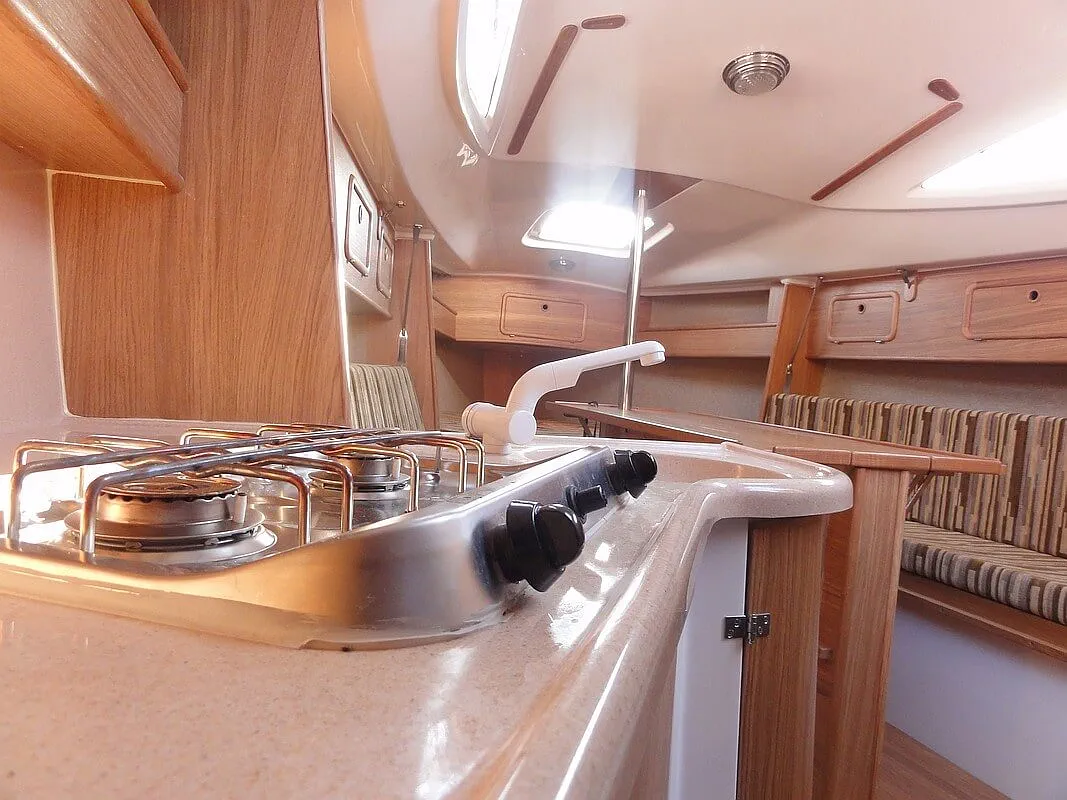 - ponadto w kambuzie: deska do krojenia, 2 noże do krojenia, cedzak, miska do sałatek, chochla do zupy, 2 garnki, patelnia, czajnik