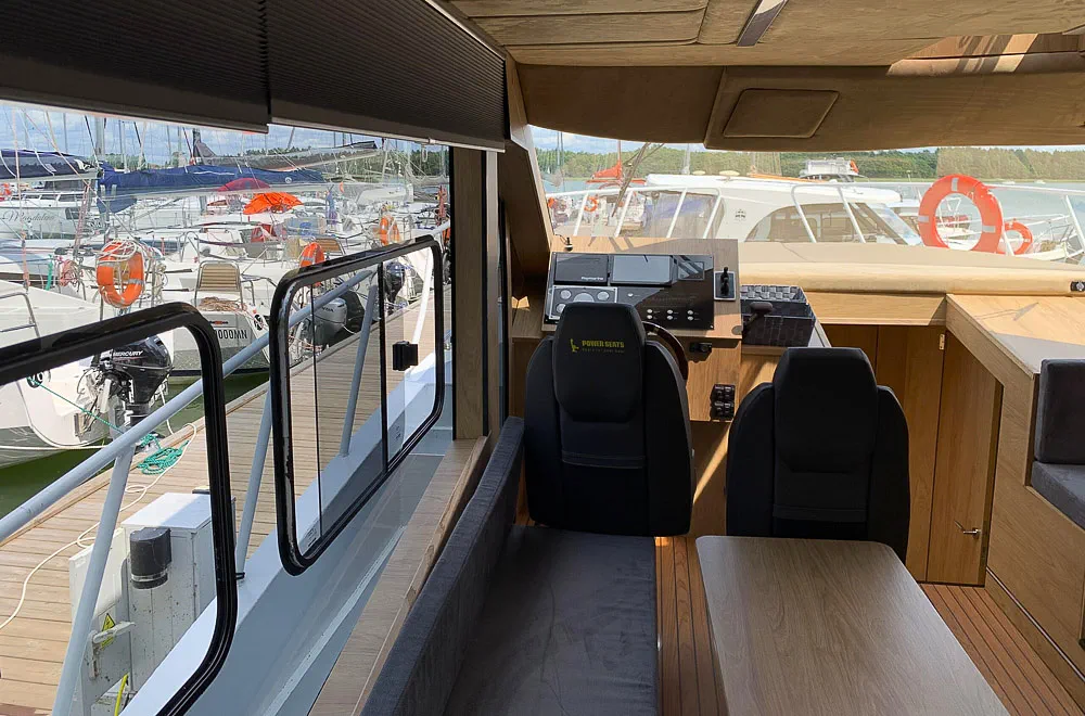 Dodatkowo miejsce sternika wyposażono w dwa wygodne fotele (także dla towarzysza podróży) oraz drzwi przesuwne dzięki którym sternik szybko może wyjść na pokład jachtu,