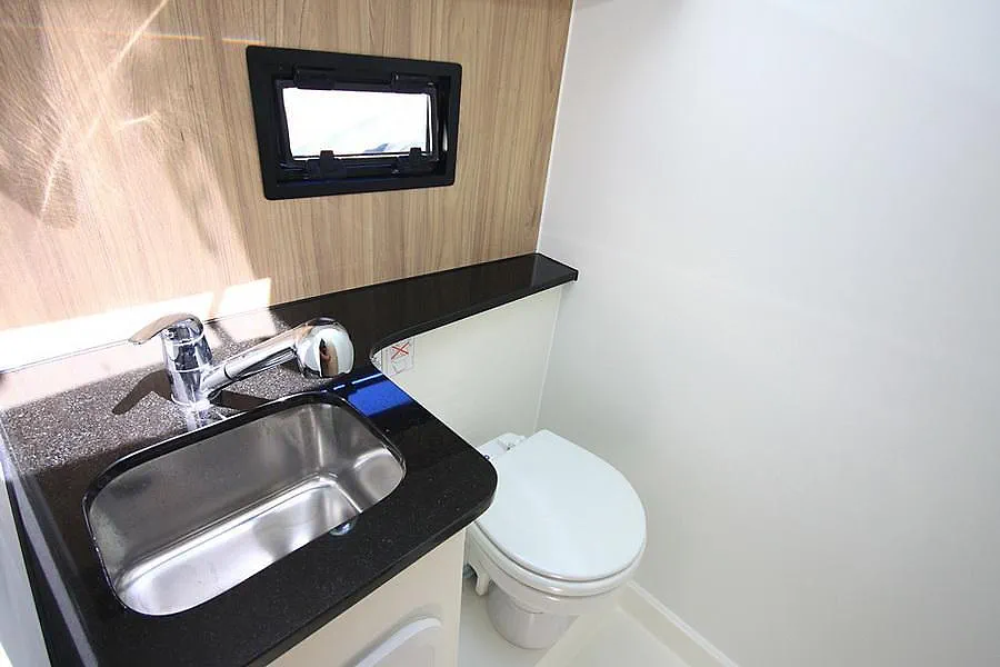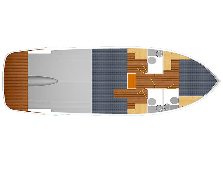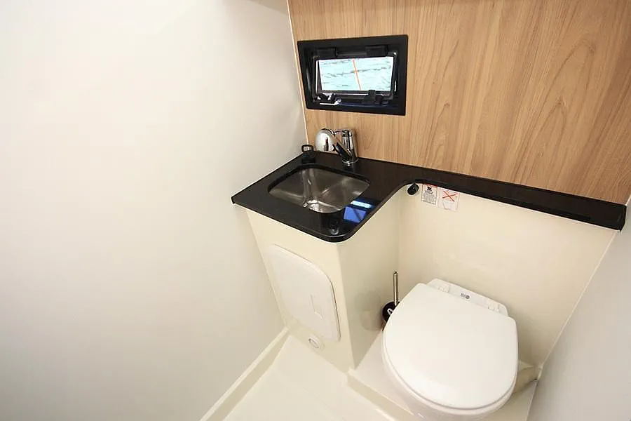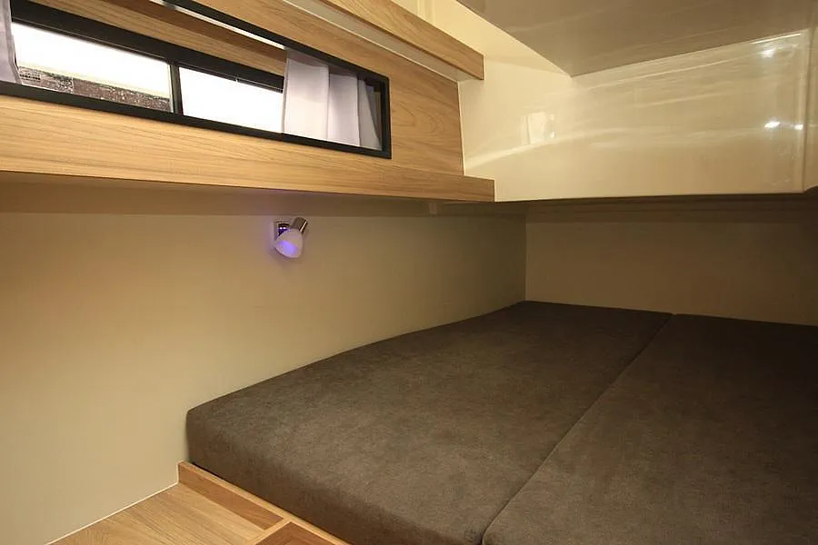 Funkcjonalne i przytulne wnętrze zapewniające wygodne warunki wypoczynku na wodzie dla nawet 8 osób, trzy podwójne oddzielnie zamykane kabiny + dwa wygodne miejsca w kokpicie.
