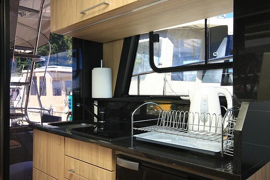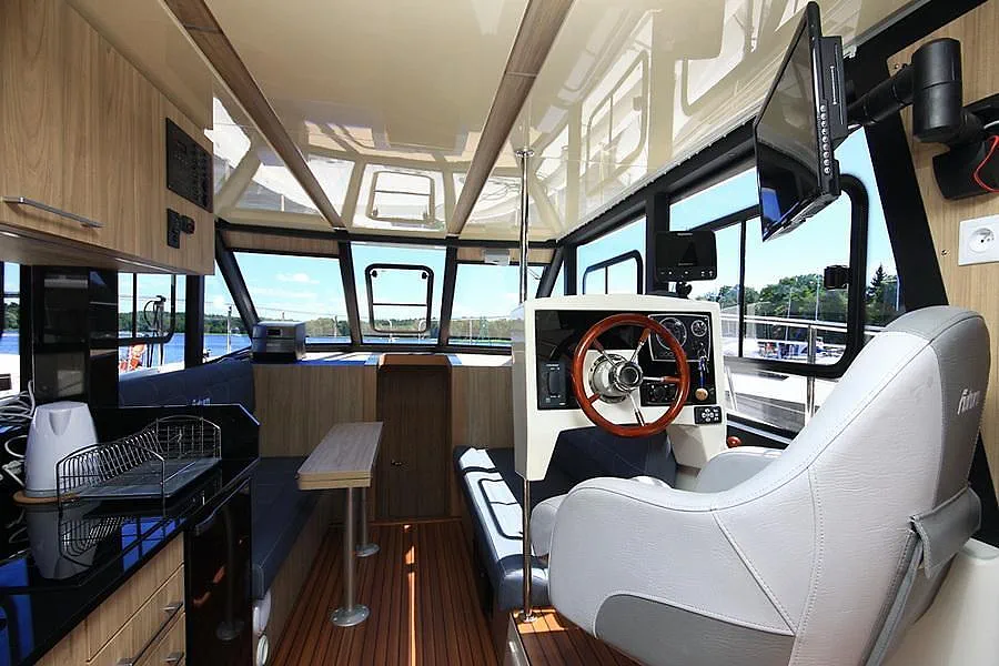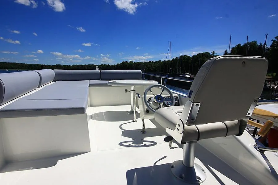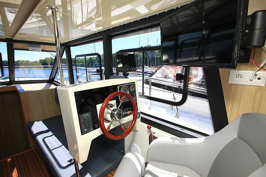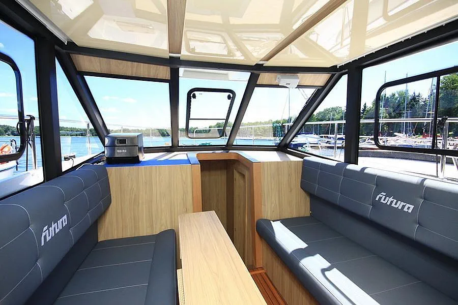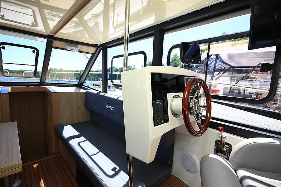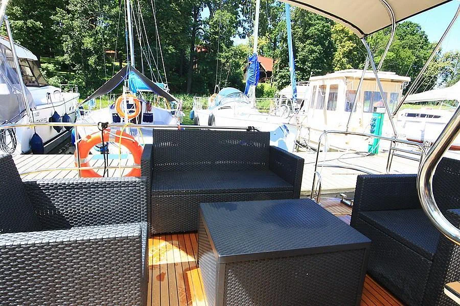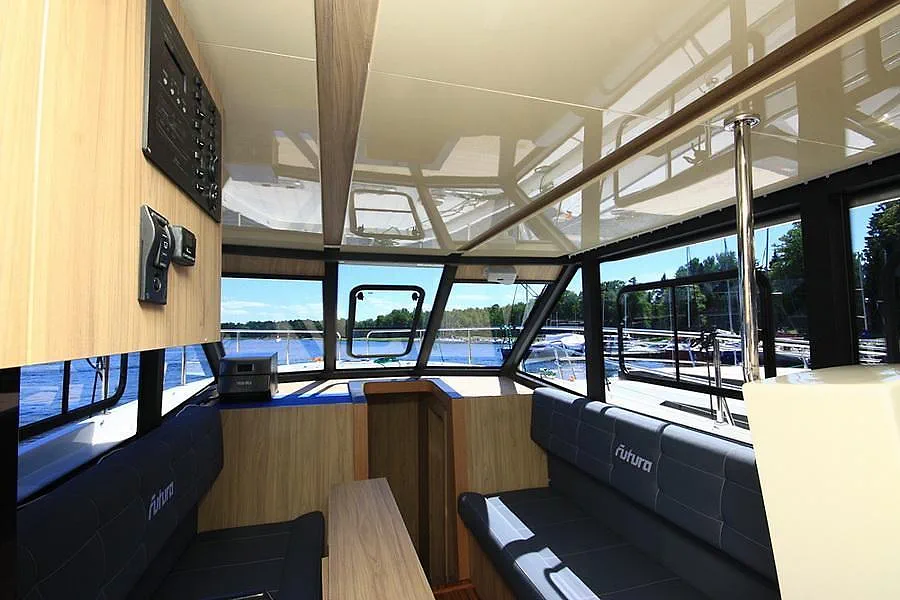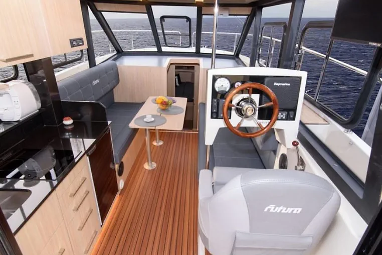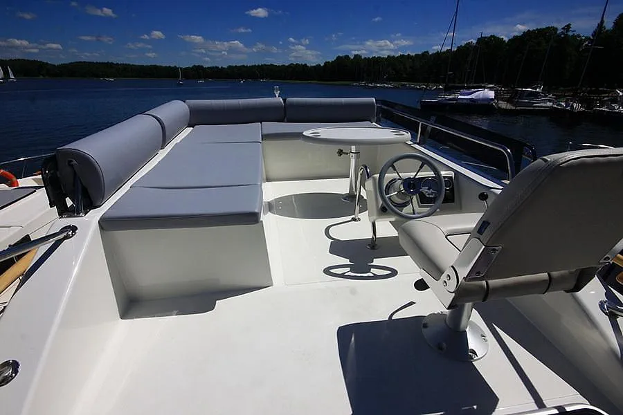 Wszystkie elementy wykonane są ze szczególnym naciskiem na estetykę. Przy doborze materiałów kierowaliśmy się przede wszystkim wysoką jakością. Przestronna mesa wyposażona w dwie kanapy, pozwoli na komfortowe spędzenie czasu. Umiejscowienie stanowisk sternika pozwala całej załodze cieszyć się wspólnym czasem niezależnie od tego czy chcą spędzić go na trapie, w mesie czy może w pełnym słońcu na fly decku.