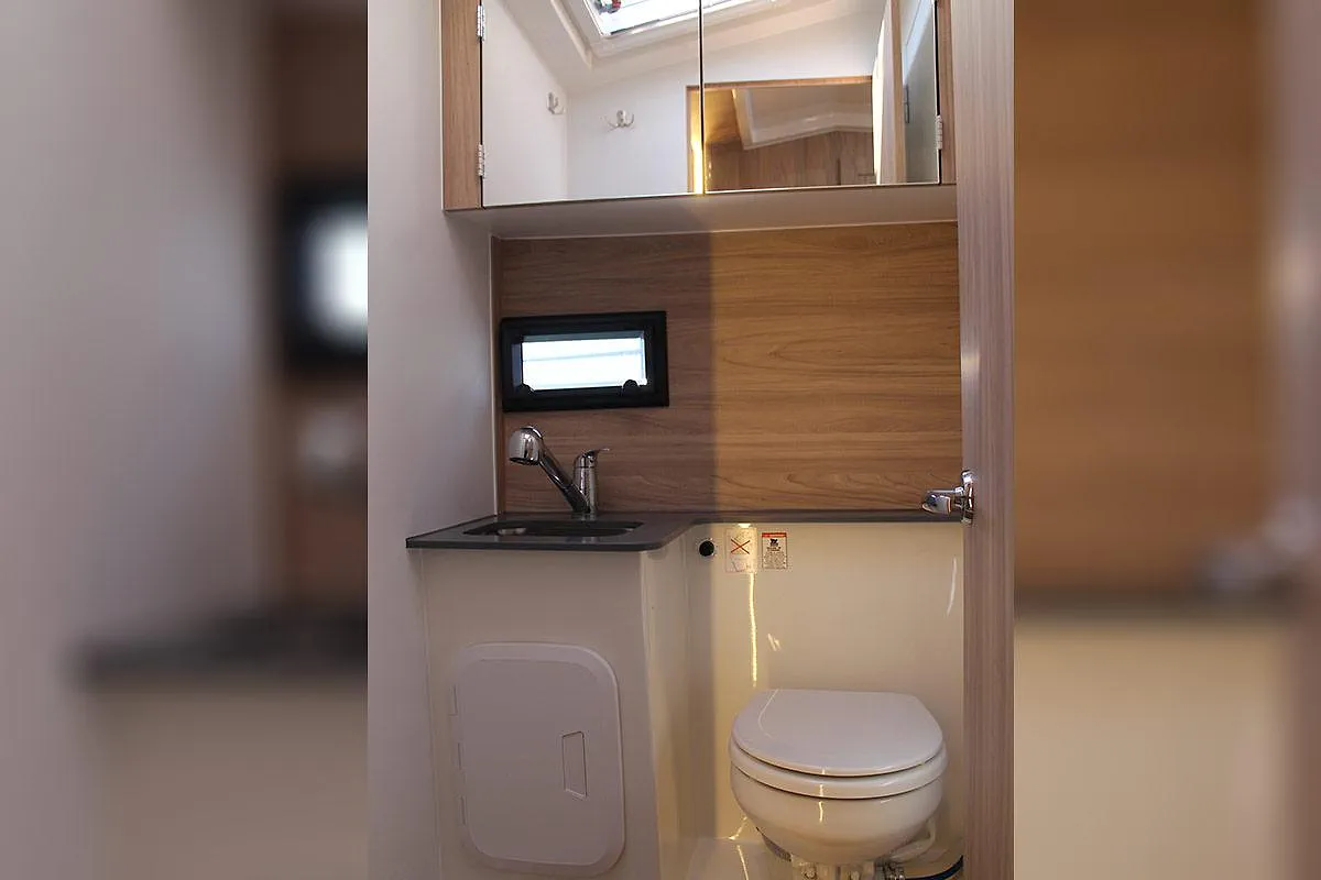 Na jachcie znajduję się 3 łazienki , w każdej kajucie. Na dachu znajduje się drugie stanowisko sterowe, w wersji fly deck. Jacht posiada 2 stery strumieniowe , co zdcydowanie ułatwia manewrowanie jachtem w porcie.