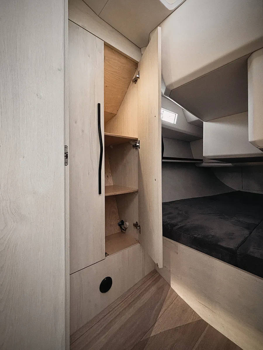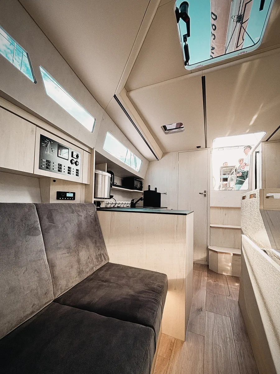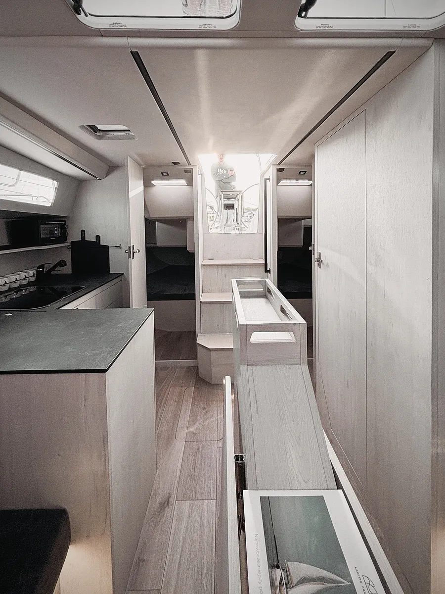 Przestrzeń i praktyczność są dwiema podstawowymi cechami Legion 360. Trzy osobne obszerne kabiny, wygodna toaleta z prysznicem i szeroka messa, w której spędza się głownie czas spełniają założenia projektantów jachtu. W centralnym punkcie kokpitu znajduje się składany stolik z wbudowanym ploterem z mapami akwenu, po którym pływamy, oraz wszystkimi parametrami, takimi jak: prędkość, siła i kierunek wiatru, głębokość. Mało tego, możliwy jest także dostęp do Internetu. Legion 360 posiada duże, poprowadzone po całej długości nadbudówki okna, które zapewniają oświetlenie wnętrza naturalnym światłem, a także pionowo wyniesioną ponad pokład nadbudówkę na dziobie, która może kojarzyć się z grillem samochodowym.