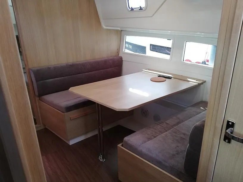 Przestrzeń pod pokładem przywita każdego przytulnością i odczuwalną wygodą – umożliwi to szerokość całkowita jachtu prawie 3m. Asymetryczna kabina dziobowa zapewni lepszą komunikację i większe wykorzystanie miejsca na część wypoczynkową ze stołem. Kabina rufowa o imponującej szerokości ponad 155cm gwarantuje nie tylko wygodny sen i wypoczynek, ale także dzięki jej poprzecznemu rozplanowaniu – bardzo ważną powierzchnię magazynową/techniczną za jej ścianką w części rufowej. A wszystko to we wnętrzu uzupełnione praktycznymi szafkami i półkami, precyzyjnie wyprodukowanymi materiałami najwyższej jakości i światłem płynącym z dużych okien, tak aby użytkownik nie tracił kontaktu z otaczającą przyrodą.