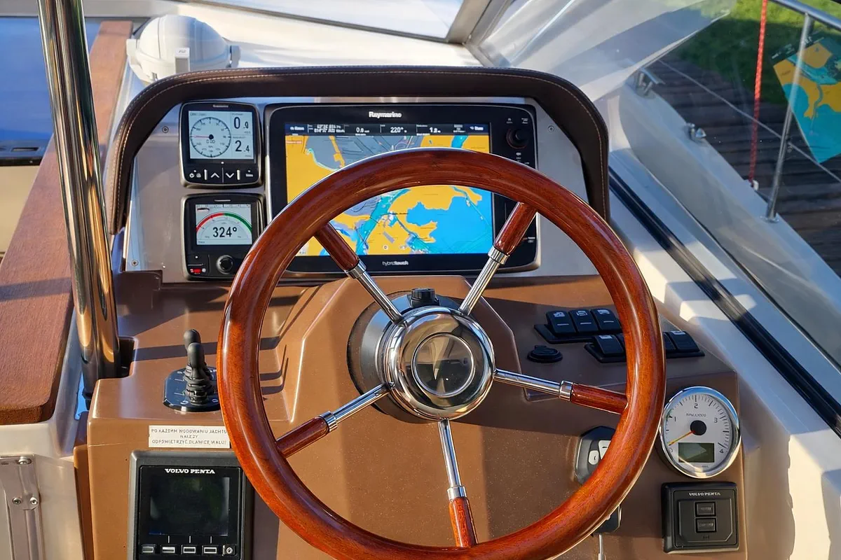 Nautika 1300 to nowoczesna i w pełni wyposażona łódź typu houseboat, stworzona z myślą o wygodnym wypoczynku na wodzie. To idealny wybór dla osób, które chcą połączyć swobodę żeglugi z komfortem porównywalnym do apartamentu. Na pokładzie znajdziesz wszystko, czego potrzeba do relaksu – przestronny kokpit z teakowym stołem, wygodne materace do opalania oraz elegancko wykończone wnętrze w nowoczesnym stylu. Dzięki klimatyzacji i wydajnemu ogrzewaniu rejsy są komfortowe niezależnie od pogody. Łódź została wyposażona w mocny silnik Volvo oraz ster strumieniowy, co sprawia, że manewrowanie jest wyjątkowo proste nawet dla mniej doświadczonych sterników. Zaawansowana elektronika pokładowa, autopilot i systemy nawigacyjne zapewniają pełne bezpieczeństwo i wygodę podczas rejsu. Na dłuższe wyprawy docenisz także bogate wyposażenie: dwie lodówki, pełne zaplecze sanitarne, system audio, telewizor oraz dodatkowe źródła zasilania, w tym agregat i panele solarne.