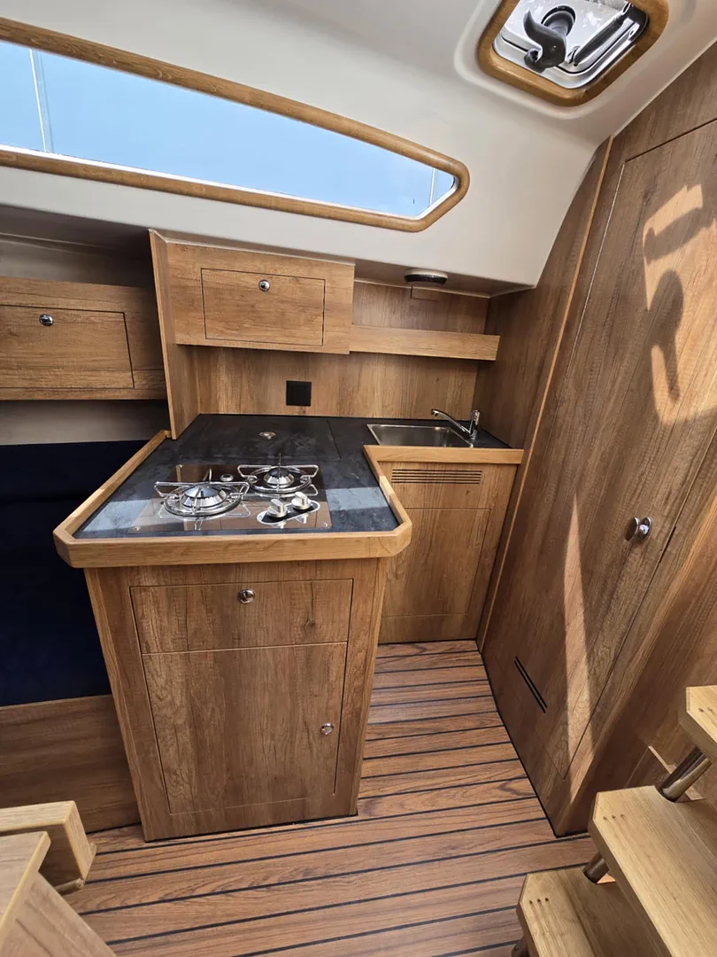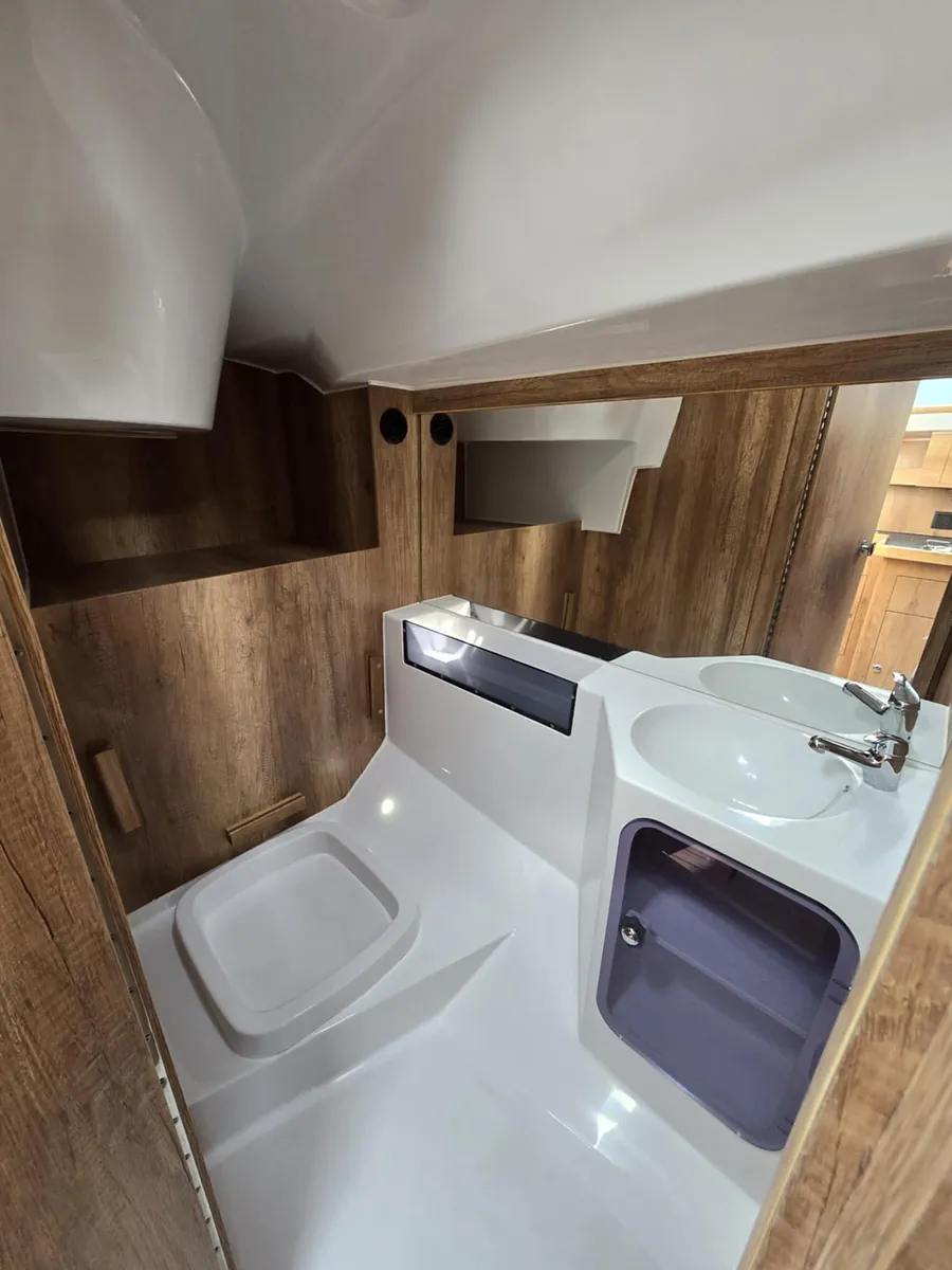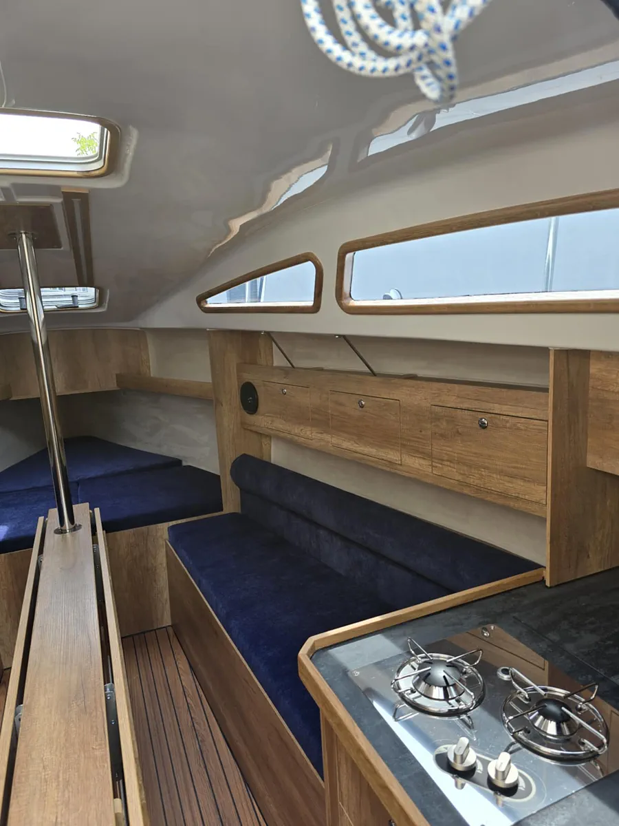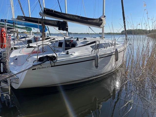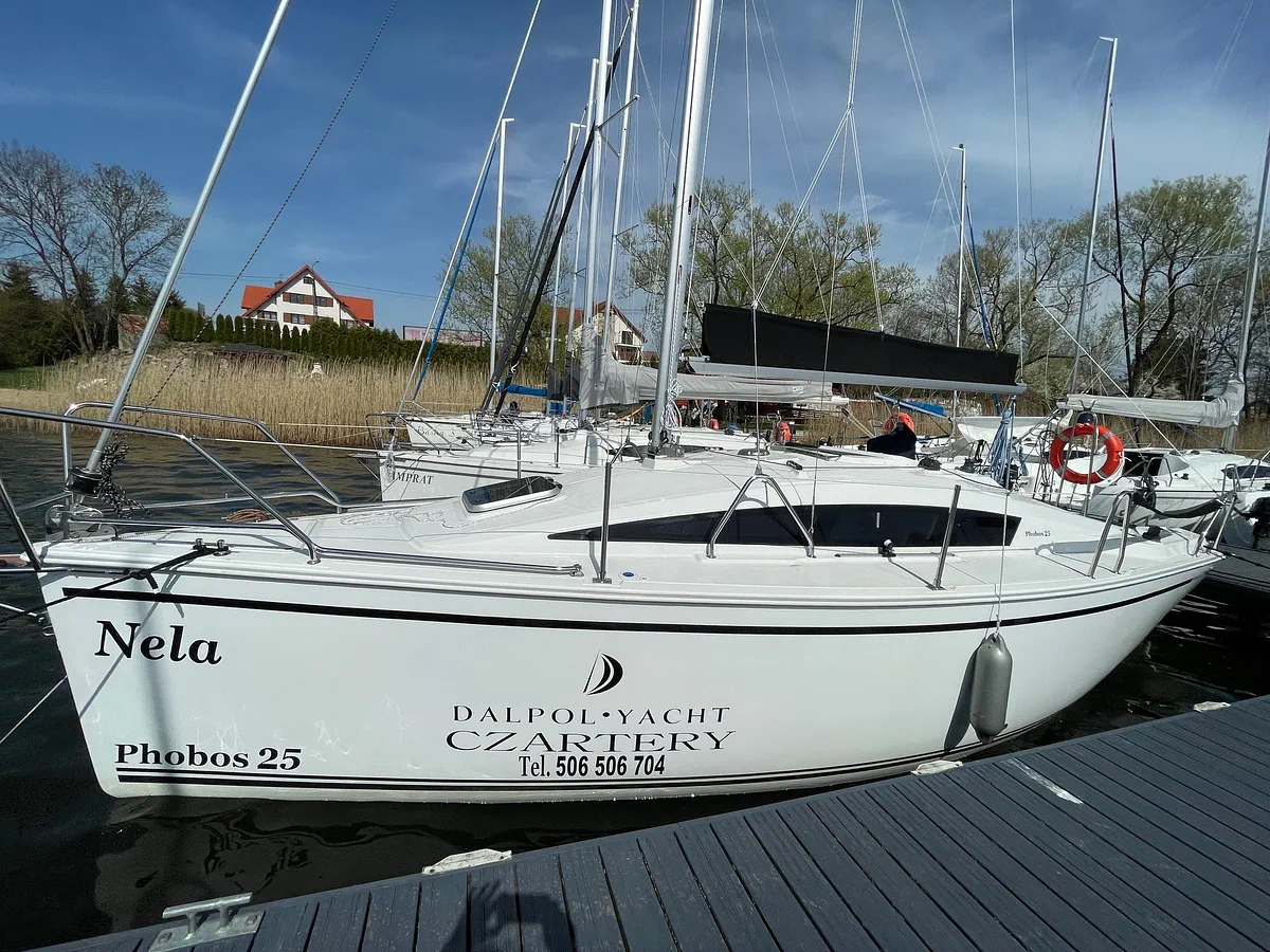 Phobos 25 Exclusive nawiązuje stylistycznie do nowoczesnych śródziemnomorskich jachtów. Długa nadbudówka z charakterystycznymi dużymi oknami pozwala zamontować nawet sześć otwieranych okien i luków, co zapewnia ponadprzecietną wentylację i doświetlenie wnętrza. Jacht wyróżnia się dużym kokpitem z którego jest znakomita widoczność w stronę dziobu. Aż cztery osobne schowki kokpitowe ułatwiają przechowywani niezbędnych dla żeglarzy przedmiotów. Zaprojektowany przez znanego regatowca Wojtka Spisaka „szybki” kadłub Phobosa 25 jest szeroki i stosunkowo płaski. Z jednej strony gwarantuje znakomitą stateczność, a z drugiej sporą pojemność wnętrza. Prezentowane na zdjęciach modele mogą różnic się zabudową w czarterze gdyż ciągle rozbudowujemy flotę, wprowadzamy nowe jednostki Jachty, stylizujemy w nowoczesny sposób tak aby zapewnić Wam wyższy komfort i zaprezentować jednostki w coraz to nowszych odsłonach. Dane techniczne Rok budowy: 2025 Długość: 7,49 m Szerokość: 2,86 m Zanurzenie min/max: 0,34/1,44 m Liczba koi: 6+1/ 1 kab rufowa Wysokość w kabinie: 1,80 m Powierzchnia żagli: 30 m² Silnik: 5 lub 6 KM Wyposażenie Podstawowe wyposażenie nautyczne: grot na pełzaczach, rolfok na sztywnym sztagu, lazy jack, pokrowiec bomowy, obciągacz bomu, tent na bom, relingi, fały sprowadzone do kokpitu, kieszenie na liny, kabestany samoknagujące, kosz dziobowy z kaczym dziobem, miecz uchylny, drabinka rufowa, sztormreling, ster na pawęży, brama do opuszczania masztu, stolik w kokpicie, środki ratunkowe, silnik zaburtowy 6 KM Kambuz i mesa: zamykana kabina rufowa, ogrzewanie, kuchenka gazowa, butla z gazem, lodówka, instalacja wody pitnej, zlew, zastawa stołowa, zestaw naczyń kuchennych (szklanki, sztućce, garnki, patelnia, durszlak, tarka, czajnik, deska do krojenia) , WC chemiczne Zasilanie i multimedia: Instalacja audio: radio CD, mp3, instalacja elektryczna 220V, gniazdo 12V, prostownik, przedłużacz, akumulator , ładowanie akumulatora Wyposażenie ratunkowe: kapoki ratunkowe dla: 7 osób, koło ratunkowe, gaśnica, pagaje, bosak, odbijacze, kanister na paliwo, kanister na wodę, kotwica z liną, dwie cumy, wiadro, miednica, szczotka, zmiotka, korba do kabestanów, skrzynka narzędziowa, środki czystości, W cenie: Ubezpiecznie (OC AC NNW, rzeczy osobiste), serwis na szlaku, paliwo, gaz, naładowany akumulator Dodatkowe opłaty: sprzątanie jachtu — 200 PLN opróżnienie toalety - 200 PLN parking w porcie 20 zł/doba pies na jachcie — 150 PLN