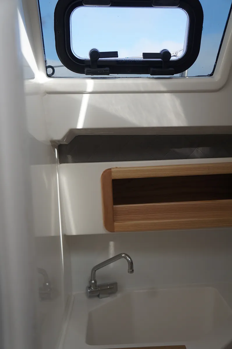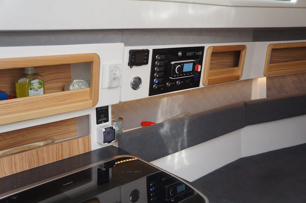 Wysokiej jakości osprzęt, kabestan samoknagujący – wszystko pracuje cicho, lekko, jak nastrojony instrument. Podest na rufie sprawia, że wchodzisz na pokład bez wysiłku, a prysznic pokładowy orzeźwia, gdy słońce stoi w zenicie.