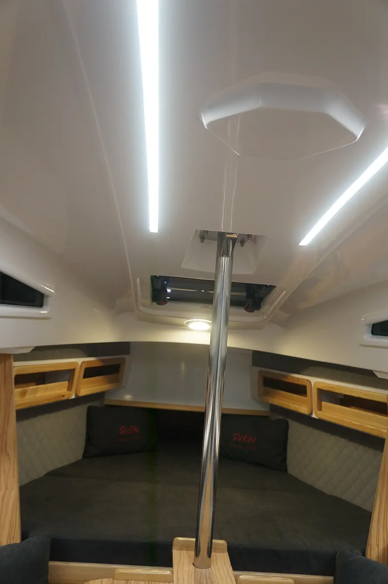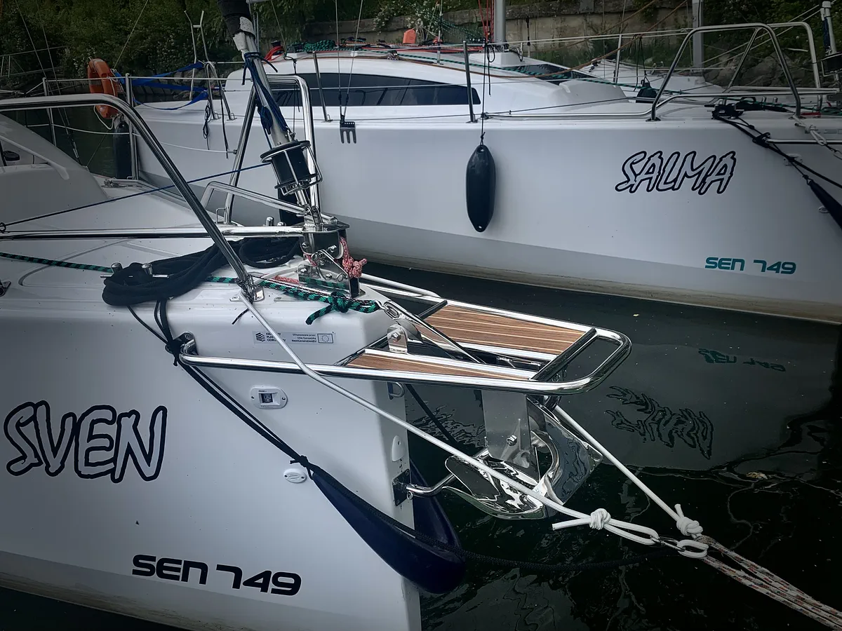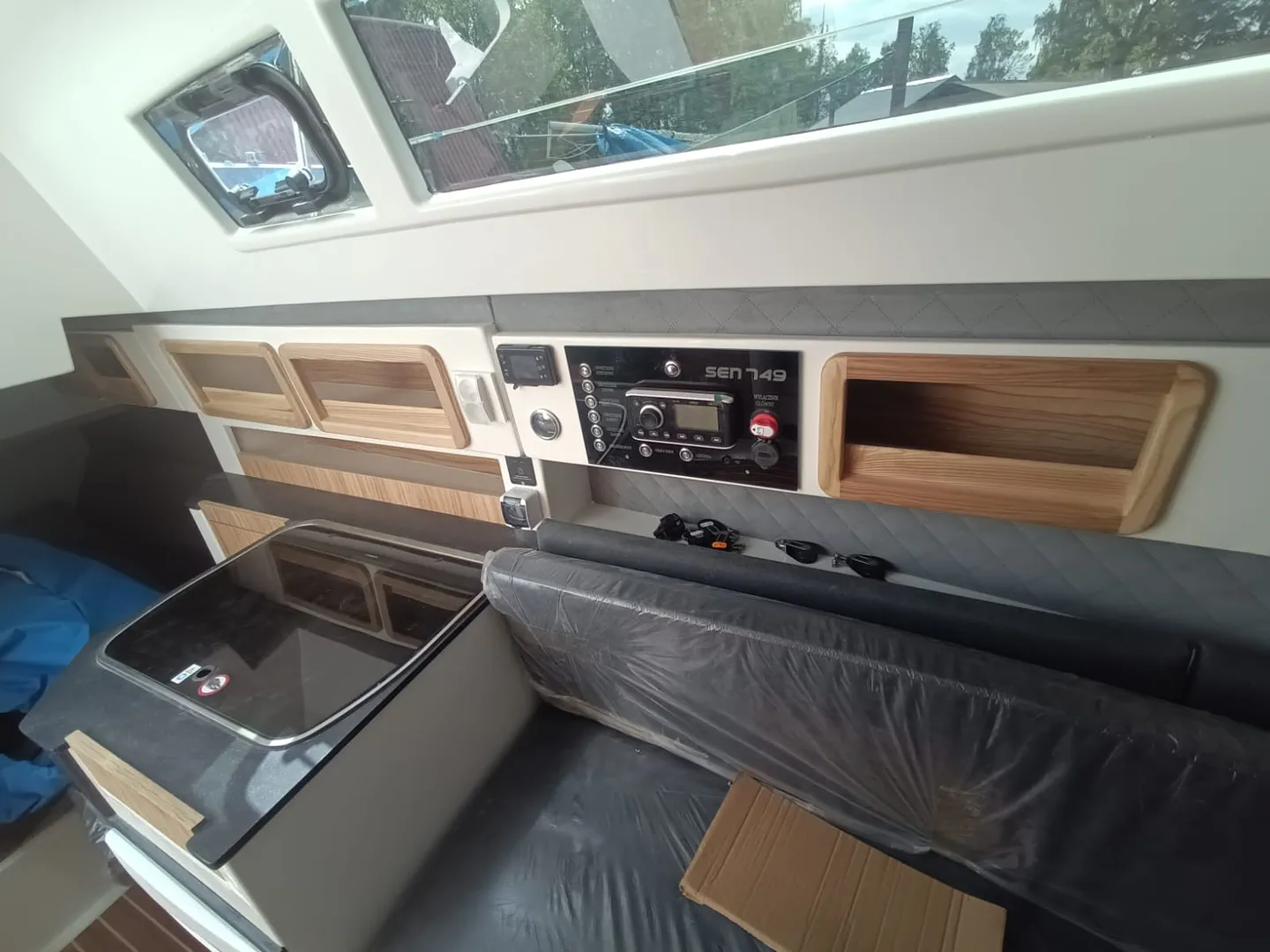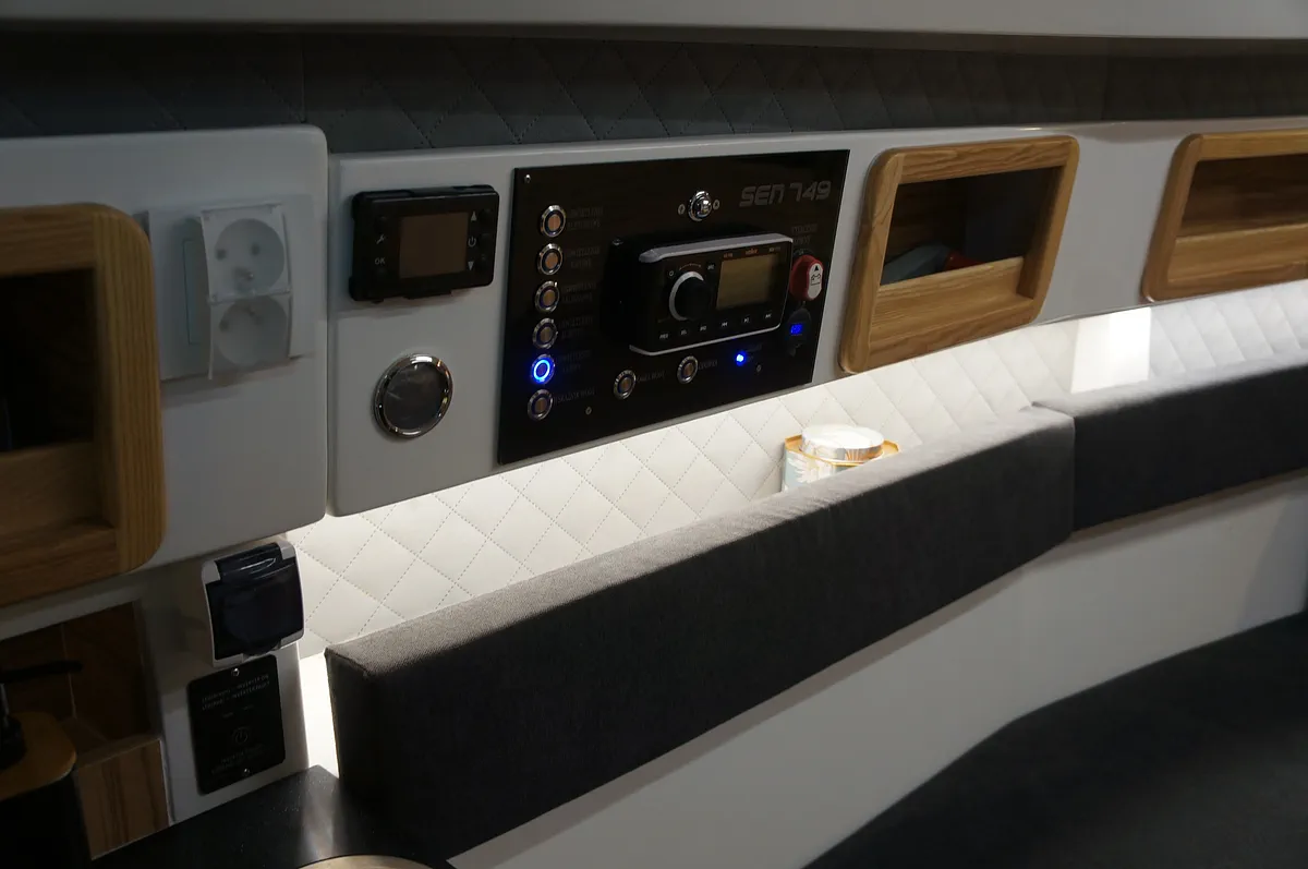 W kokpicie stolik, skromny ale zmieści filiżanki i cały twój poranek. Wysokiej jakości osprzęt, kabestan samoknagujący – wszystko pracuje cicho, lekko, jak nastrojony instrument. Podest na rufie sprawia, że wchodzisz na pokład bez wysiłku, a prysznic pokładowy orzeźwia, gdy słońce stoi w zenicie.
