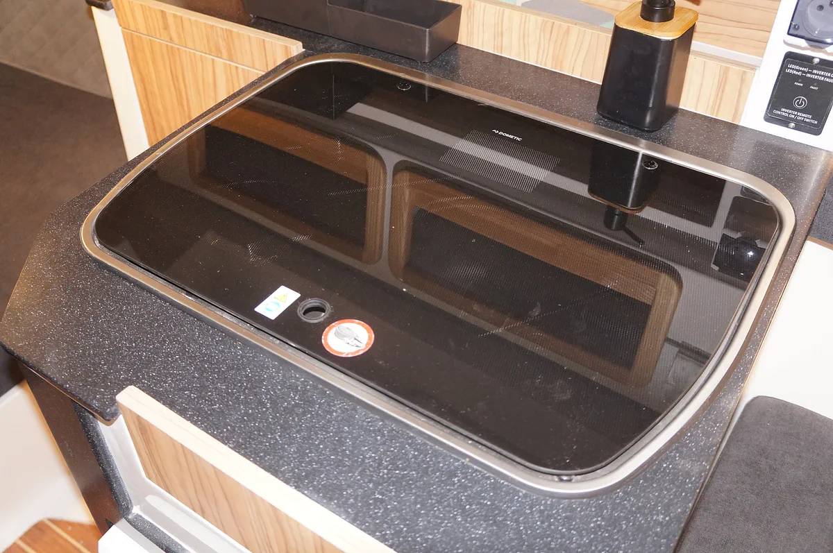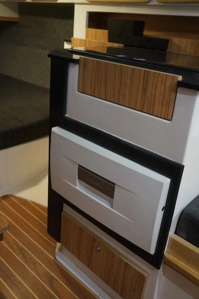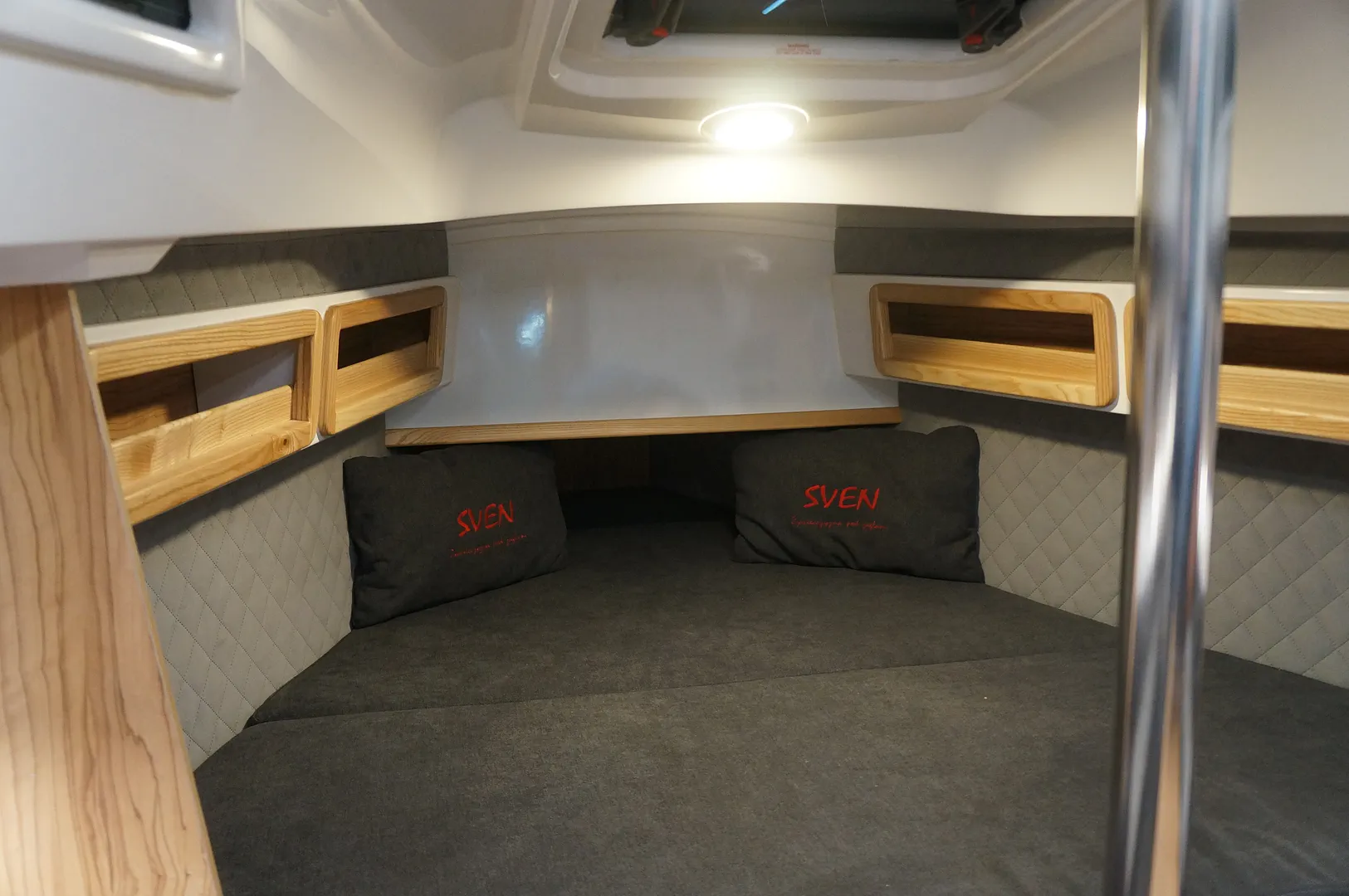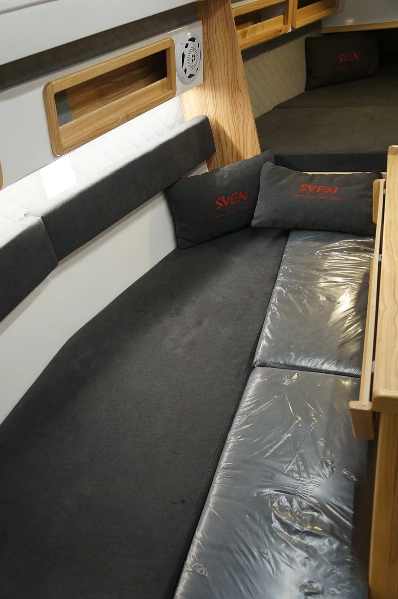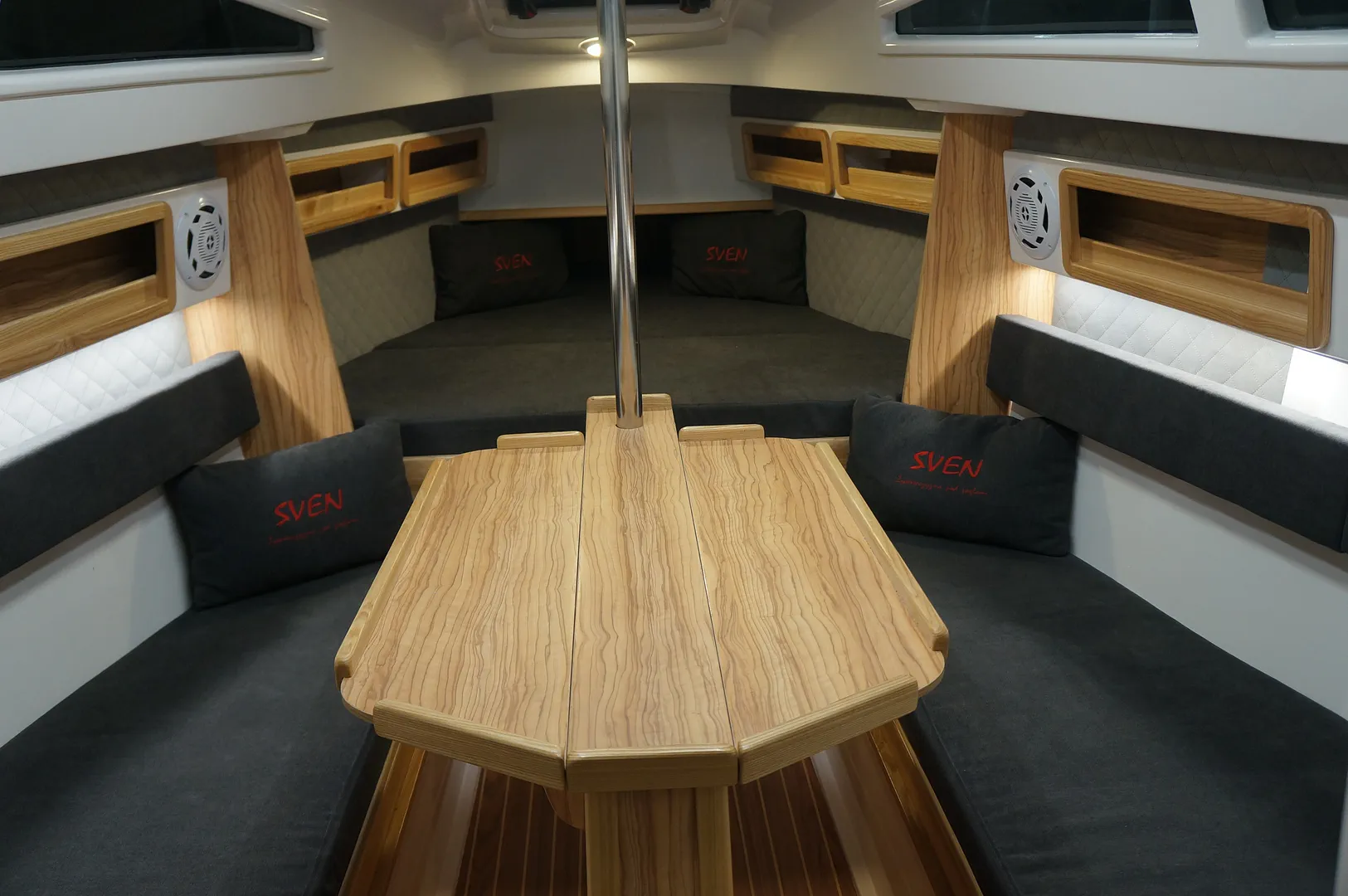 W kokpicie stolik, skromny ale zmieści filiżanki i cały twój poranek. Wysokiej jakości osprzęt, kabestan samoknagujący – wszystko pracuje cicho, lekko, jak nastrojony instrument. Podest na rufie sprawia, że wchodzisz na pokład bez wysiłku, a prysznic pokładowy orzeźwia, gdy słońce stoi w zenicie.