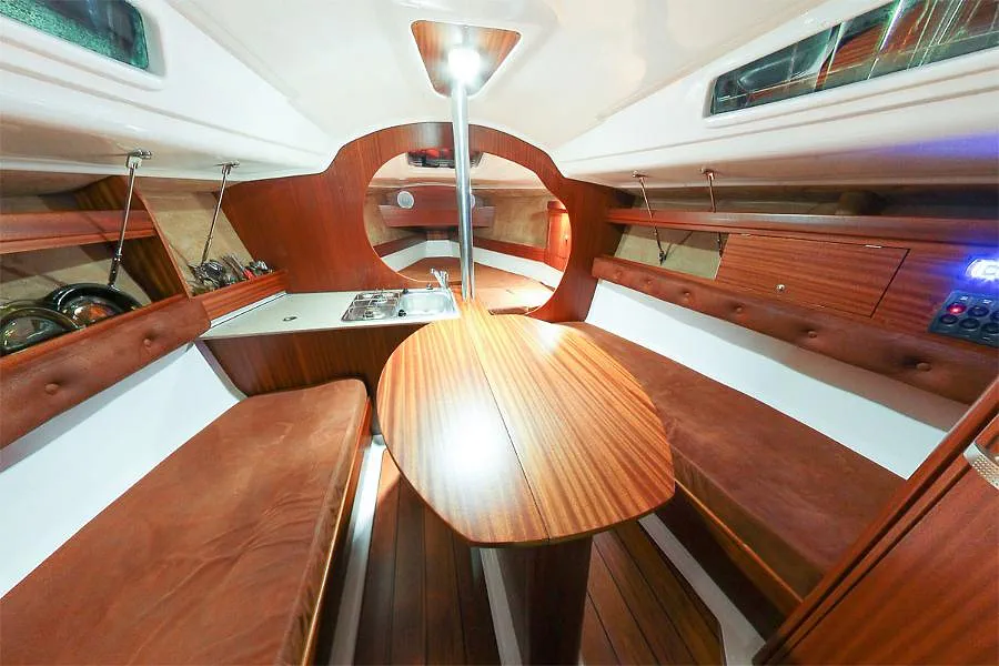 - pełne wyposażenie kambuza – zlew, pełna butla gazowa, kuchenka dwupalnikowa, garnki, patelnia, czajnik, zastawa stołowa, sztućce,