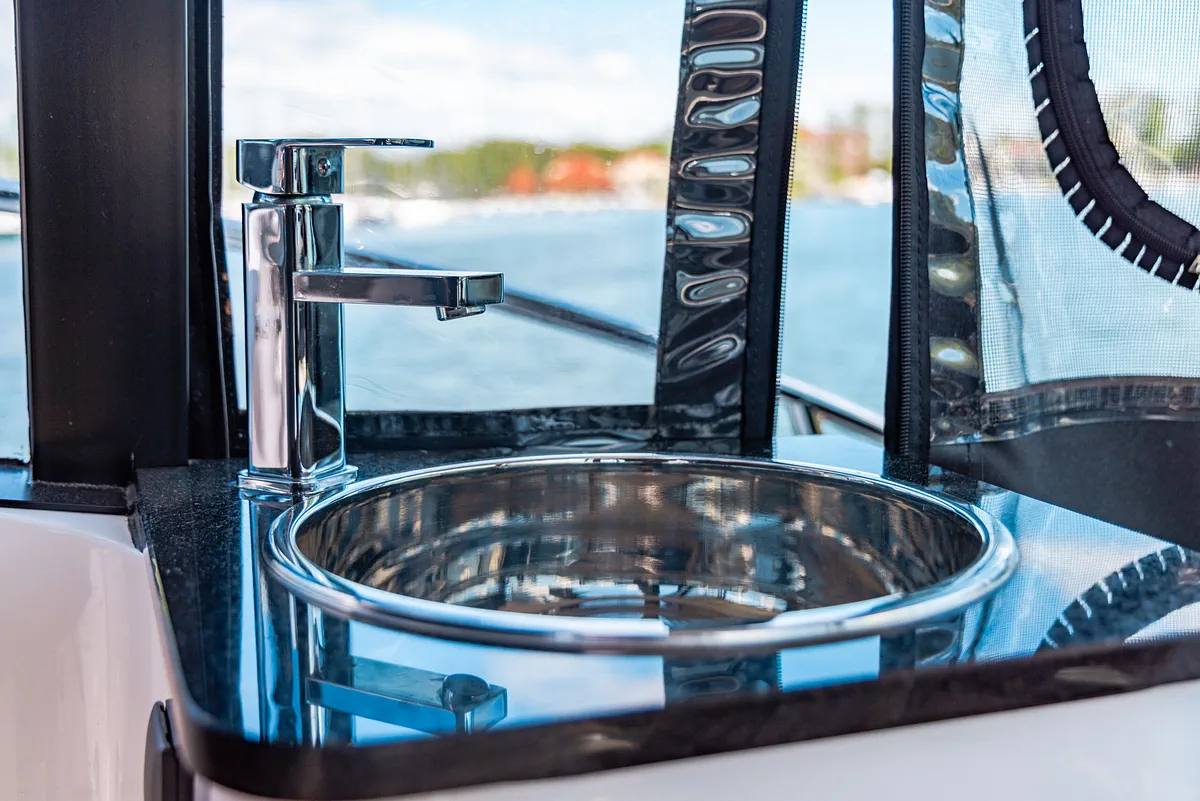 Nowy trap rufowy, większy i podniesiony o 7cm, ułatwia zejście na pomost oraz minimalizuje hałas uderzających fal podczas postojów.