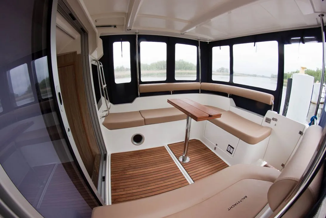 Kolejną bardzo charakterystyczną cechą jachtu Suncamper 30 są panoramiczne okna, zapewniające znakomite doświetlenie wnętrza oraz doskonałą widoczność – załoga w czasie rejsu może podziwiać przepiękną przyrodę szlaku Pętli Żuławskiej czy Kanału Elbląskiego. Jednostka jest wyposażona w dwa szklane, przesuwane drzwi, co czyni tę barkę Suncamper 30 bardzo bezpieczną podczas rejsu z małymi dziećmi – po ich zamknięciu można płynąć swobodnie, bez obaw że dzieci wyjdą/wypadną za burtę. Po otwarciu tylnych przesuwanych drzwi wnętrze jachtu łączy się z kokpitem, tworząc jedną dużą przestrzeń. Kokpit jachtu jest duży, przestrony i wygodny, na siedziskach położone są materace ze skóry ekologicznej, przed deszczem chroni użytkowników dach, przed wiatrem odpinane cabrio.